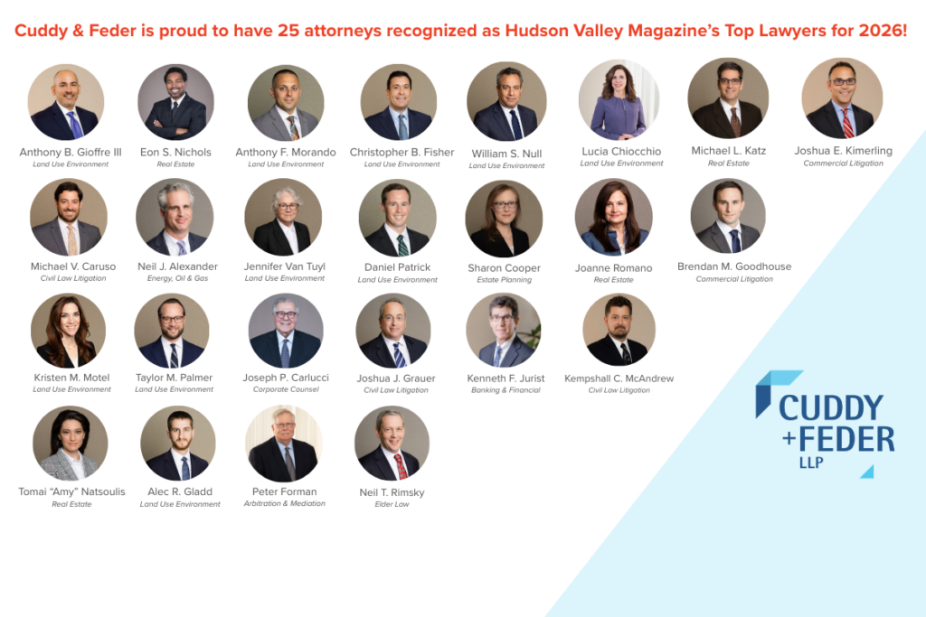 The attorneys recognized from Cuddy & Feder represent a wide range of practice areas—from Land Use and Zoning to Commercial Litigation, Real Estate and Elder Law—demonstrating the depth, experience, and versatility of the firm’s legal team.